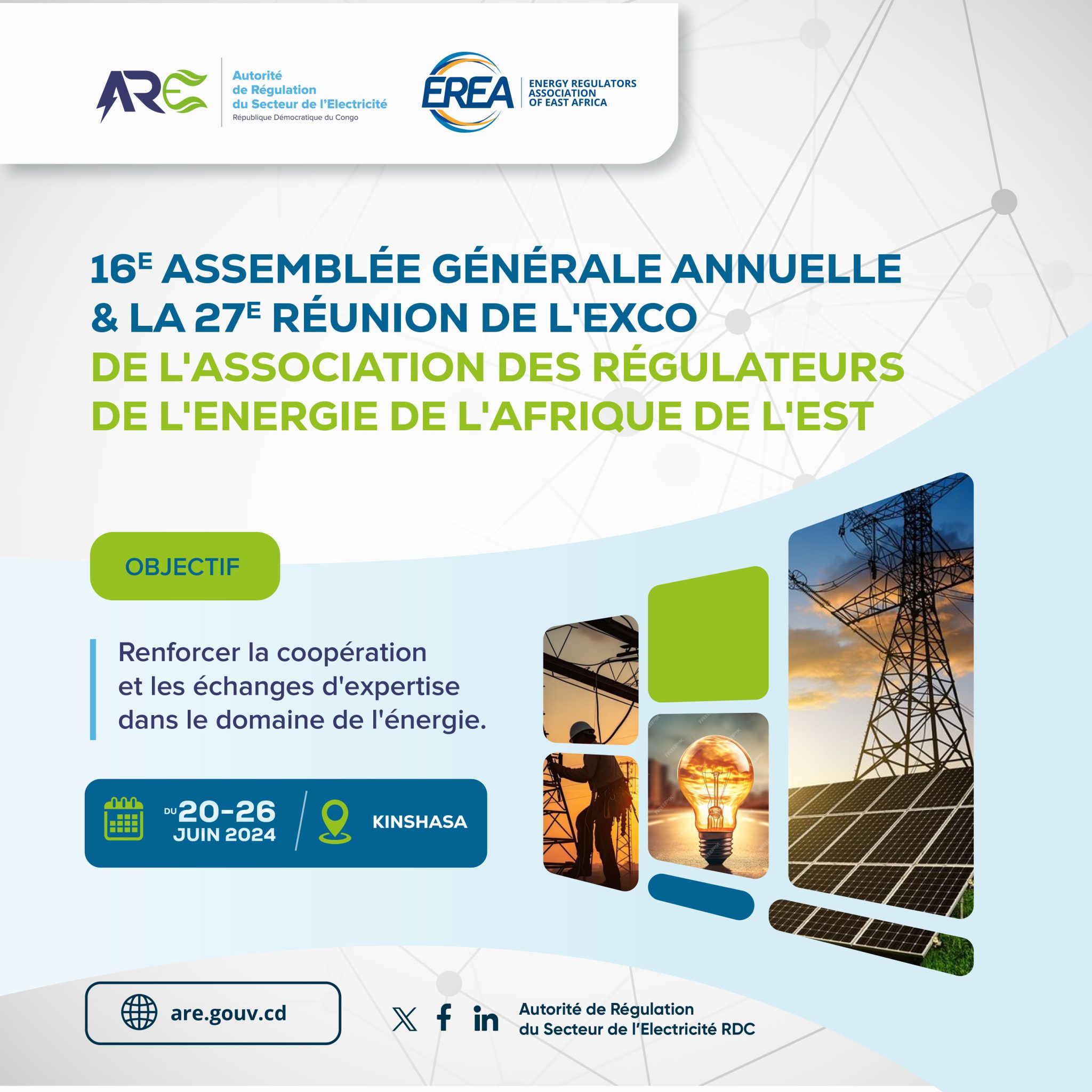 Nous sommes ravis de partager une nouvelle captivante : l’Autorité de Régulation du secteur de l’Electricité (ARE) de la République Démocratique du Congo aura l’honneur d’accueillir la 16ème Assemblée Générale annuelle et la 27ème réunion de l’EXCO de l’Association des Régulateurs de l’Energie de l’Afrique de l’Est, du 20 au 26 juin 2024.