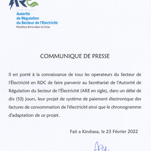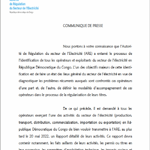 Il est porté à la connaissance de tous les Opérateurs du Secteur de l’Électricité en République Démocratique du Congo de faire parvenir au Secrétariat de